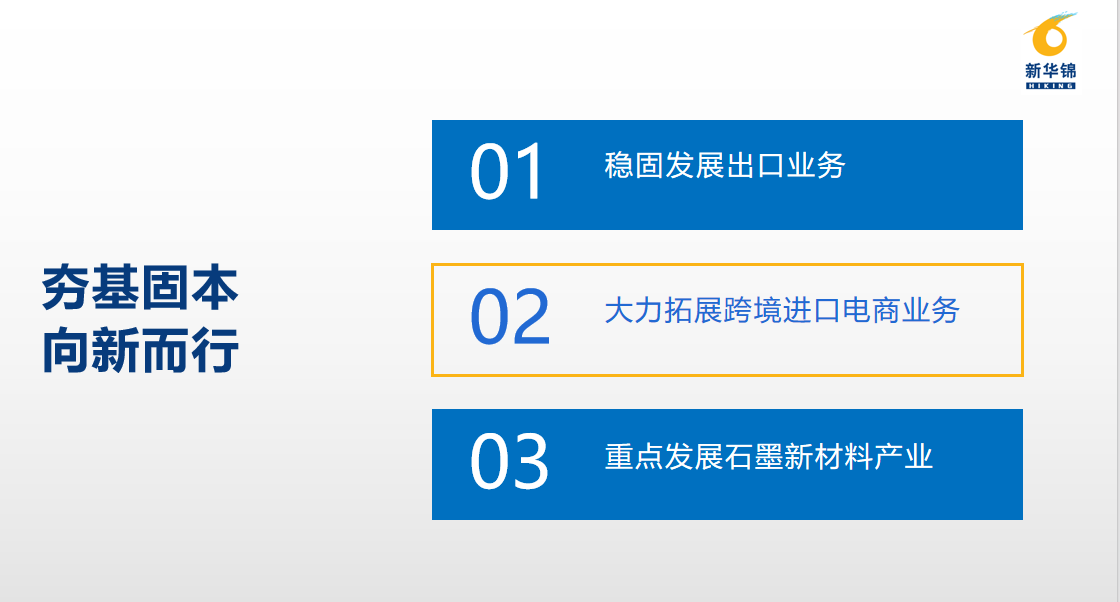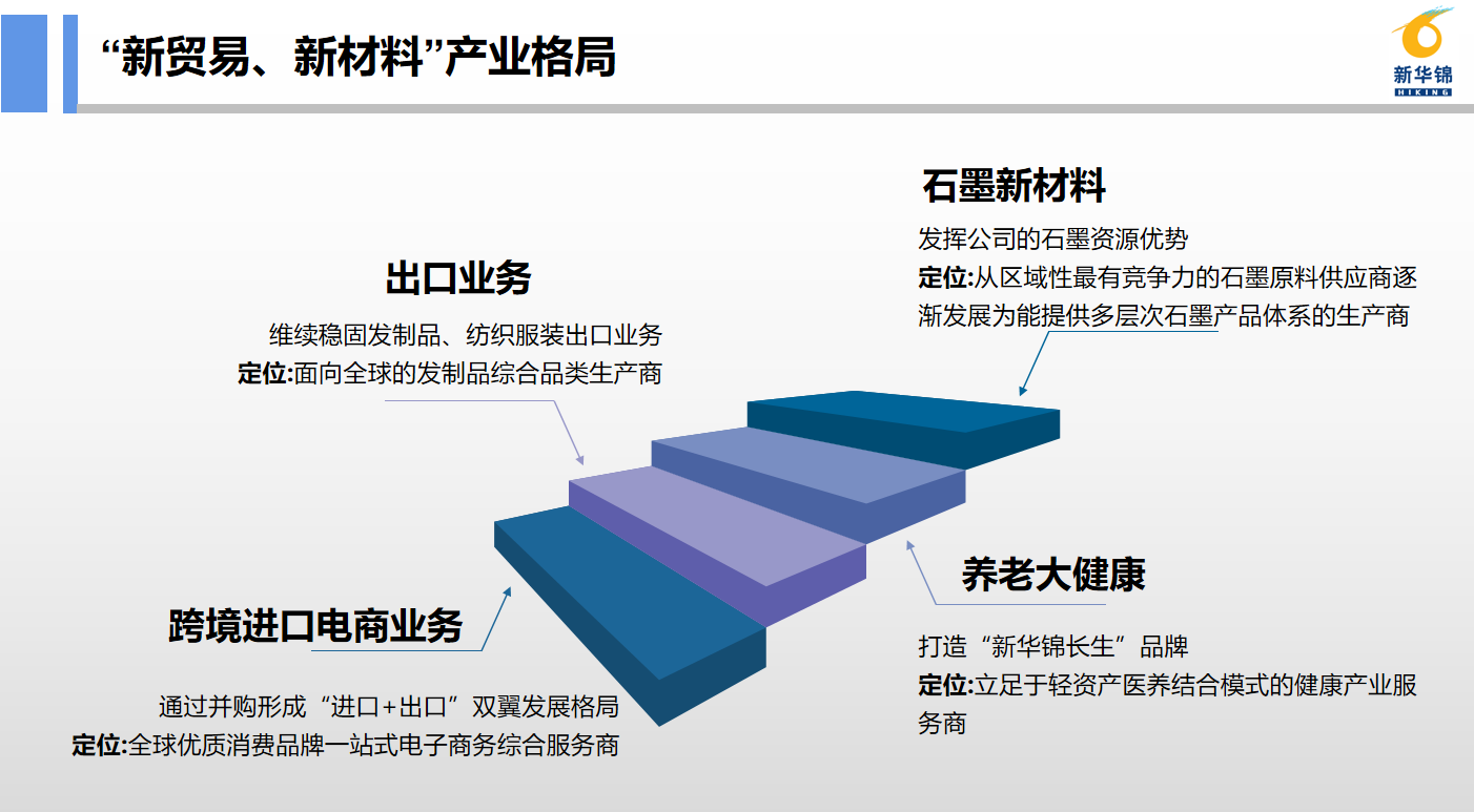 山東新華錦國際股份有限公司總部位于山東青島,是新華錦集團(tuán)旗下A股上市公司。公司在國際貿(mào)易業(yè)務(wù)領(lǐng)域深耕多年,主營發(fā)制品和紡織品服裝產(chǎn)品的生產(chǎn)加工及業(yè)務(wù)出口業(yè)務(wù),同時布局了石墨新材料產(chǎn)業(yè)和跨境進(jìn)口電商業(yè)務(wù),已逐步形成了“兩大核心戰(zhàn)略”“四個業(yè)務(wù)板塊”,初步建立了“新貿(mào)易、新材料”的產(chǎn)業(yè)格局。